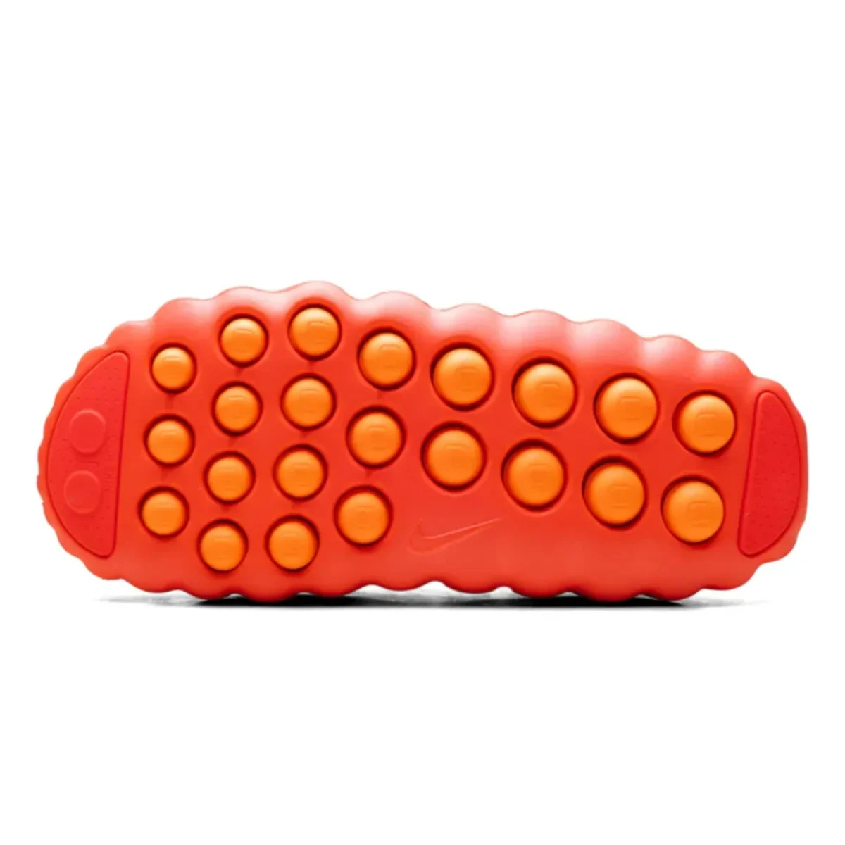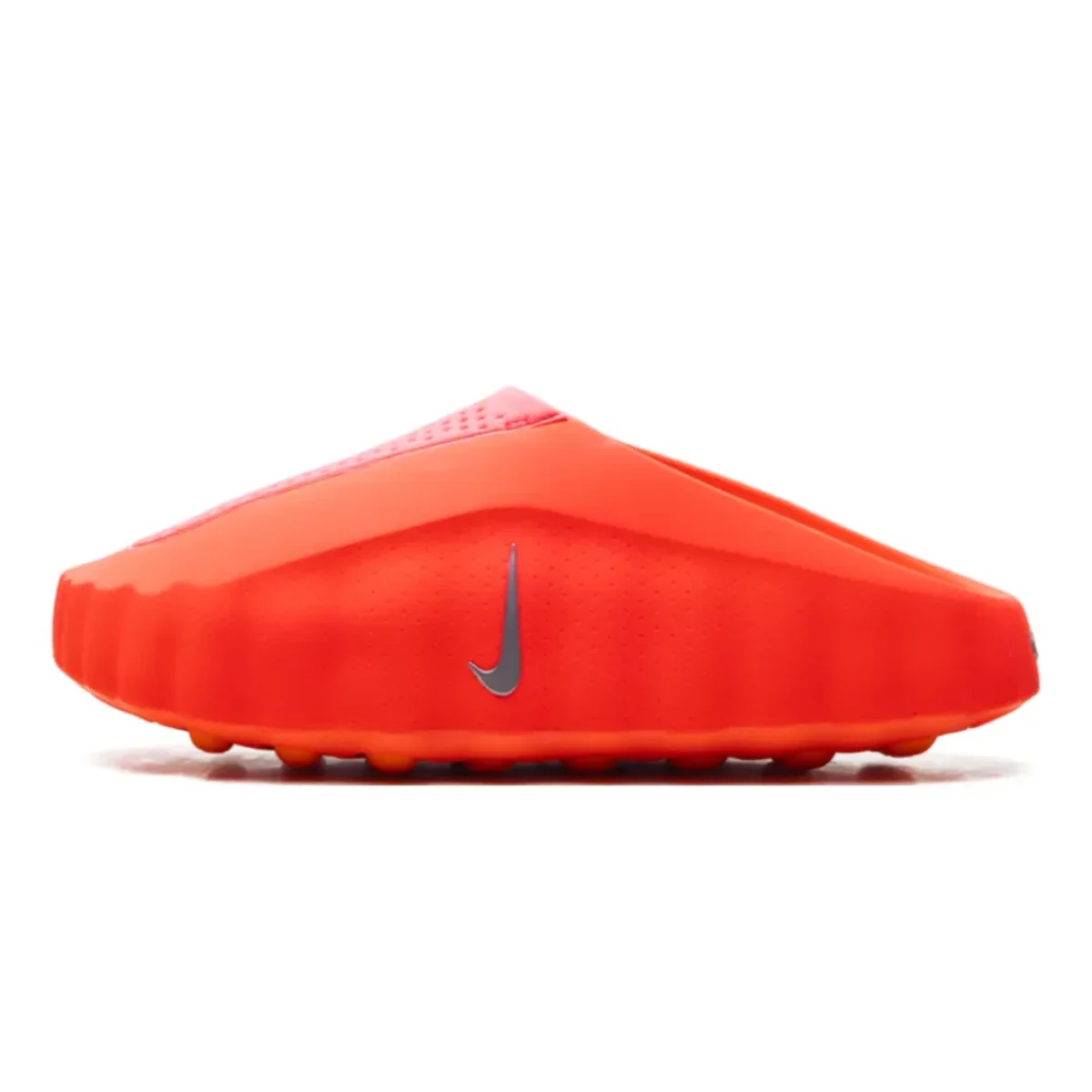 Nike says the Mind 001 uses 22 individually articulated foam nodes that help translate ground texture to the bottom of the foot, a knitted tongue with perforations for breathability, plush responsive foam, and rubber pods near the toe and heel for traction and durability. Regional Nike product pages identify the model as Women’s Pregame Mules in the Solar Red colorway.
